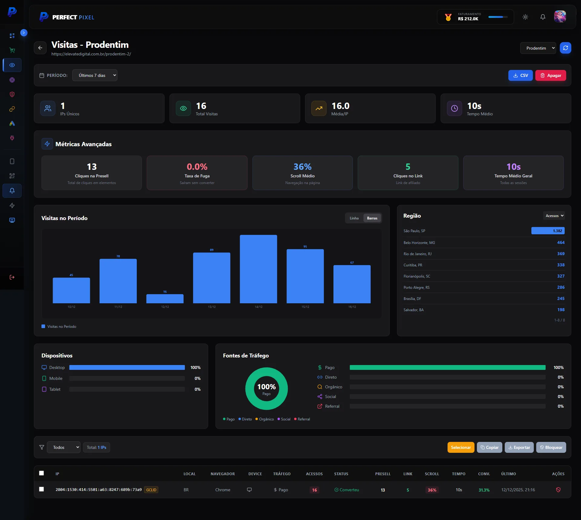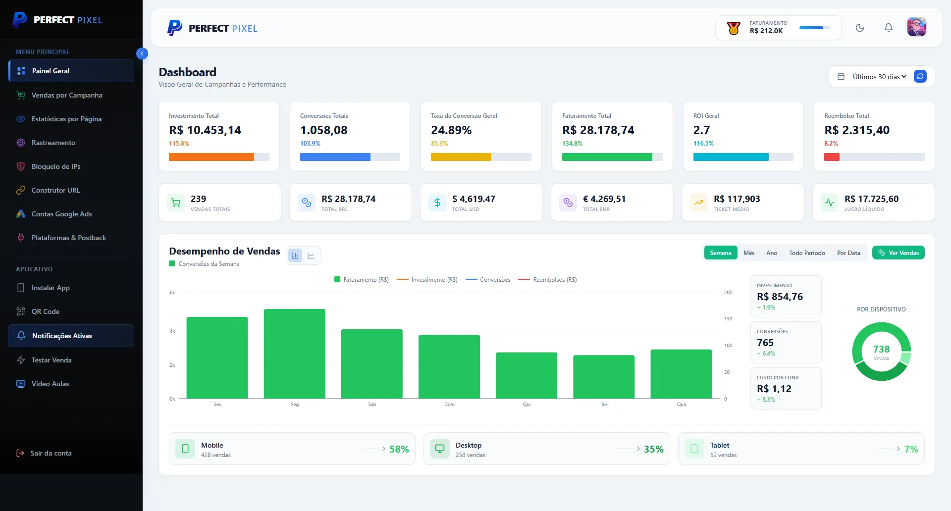 Exemplos do painel do Perfect Pixel (Dashboard, Vendas, Visitas, Tracks, URL Builder, IP Blocking e integrações).
