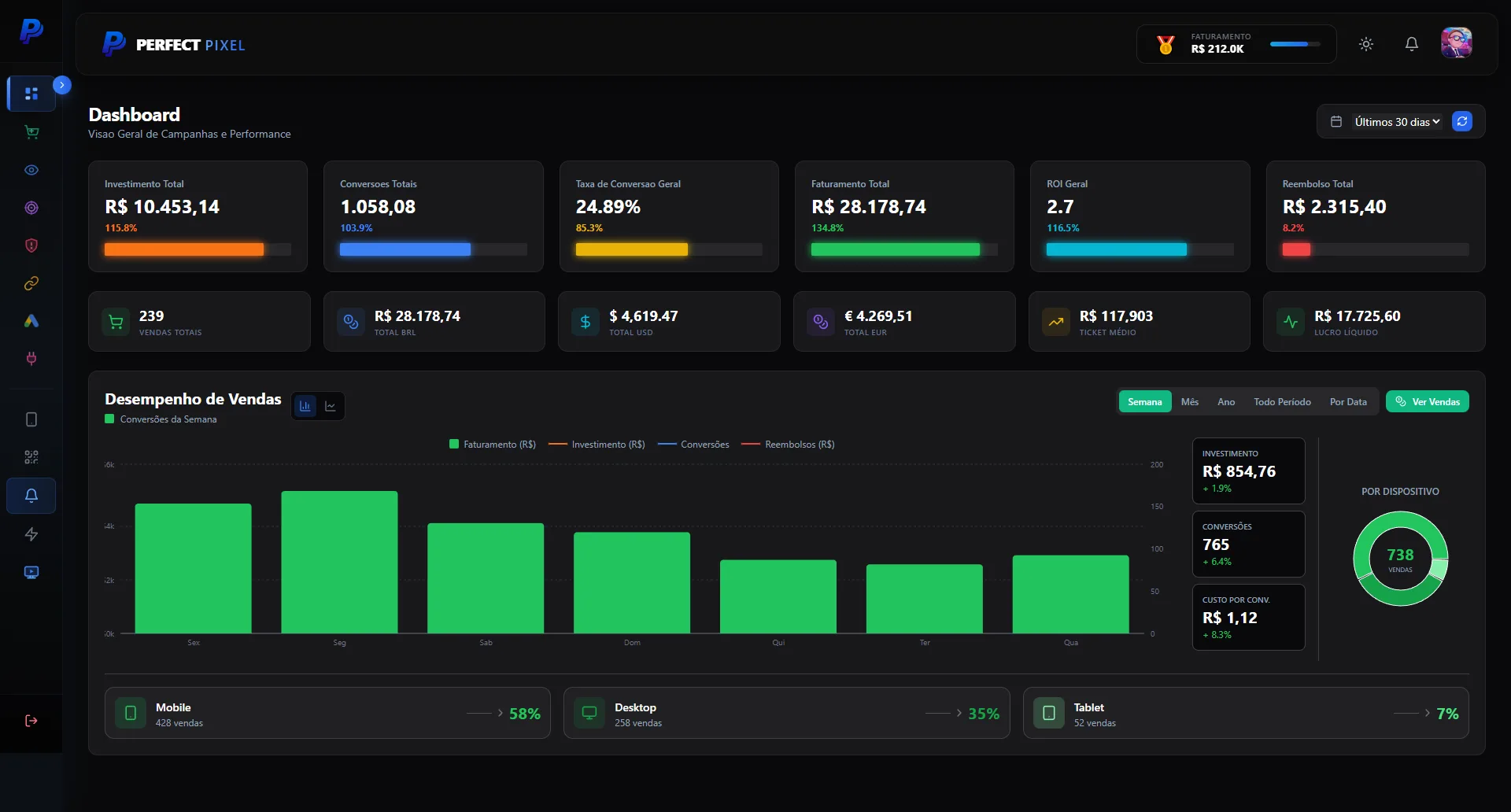 Dashboard com tudo — ROI, CPA, lucro líquido e faturamento em um lugar