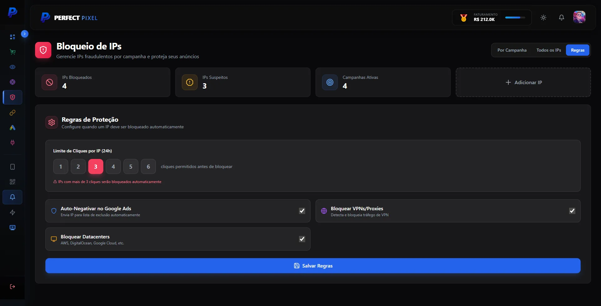 IPs que atingem o limite de cliques são bloqueados automaticamente e adicionados à lista de exclusão do Google Ads em tempo real. Seu orçamento é protegido sem você precisar fazer nada manualmente.