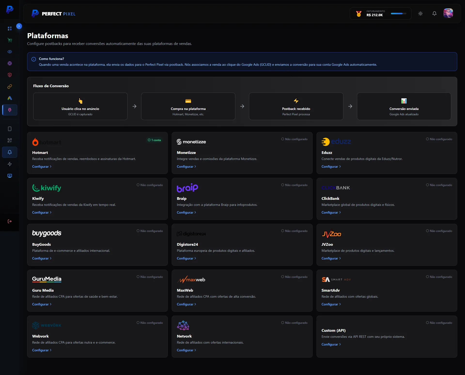 O Perfect Pixel é um aplicativo de rastreamento e atribuição de conversões para campanhas de tráfego pago. Ele conecta sua conta do Google Ads e as suas plataformas de venda (Hotmart, Kiwify, Monetizze, Eduzz e outras) para enviar conversões offline/servidor para o Google com maior precisão.