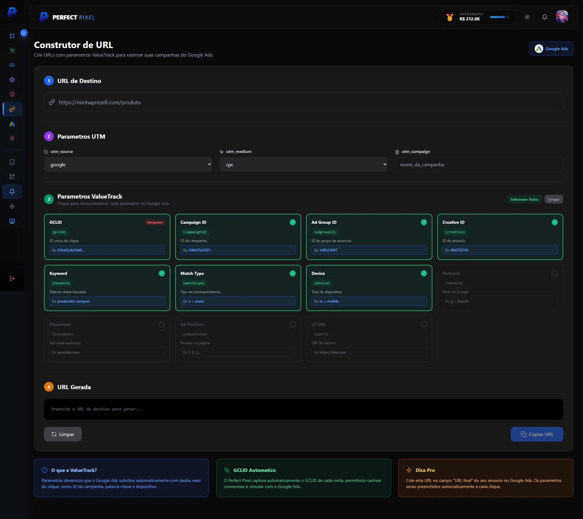 Rastreie o funil completoGere URLs rastreáveis com UTMs organizados por campanha, produto e fonte. O construtor salva seus templates e gera links prontos para colar no Google Ads. Mantenha suas campanhas organizadas desde o primeiro clique.
